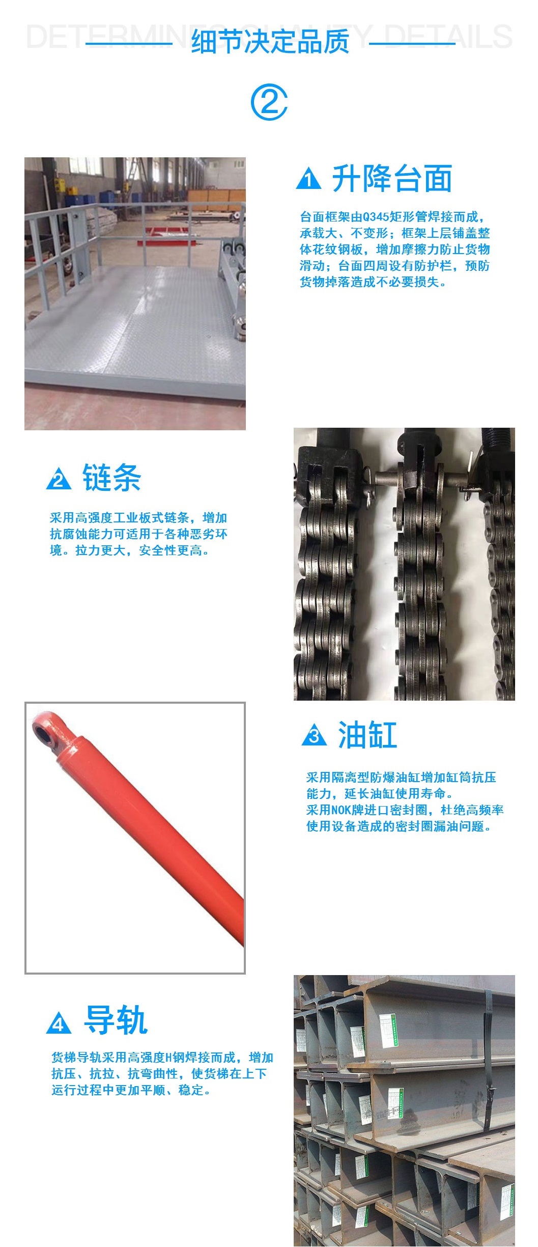 导轨式升降货梯,主要用于楼层间高空货物运输。载重1-150吨,升高高度1-45米.室内、室内外均可安装。导轨式升降货梯采用旁置油缸,运行平稳、噪音低、维修方便、使用寿命较长;停电时,可使用手动应急下降,安全、方便、快捷、实用;地坑深度一般为0-30cm,顶层高度不受限制
